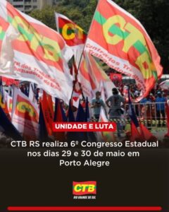 Com o lema “Unidade e Luta para Transformar o Brasil e o Rio Grande: Com Democracia, Soberania, Desenvolvimento e Trabalho Digno”, a Central dos Trabalhadores e Trabalhadoras do Brasil no Rio Grande do Sul (CTB RS) realiza, nos dias 29 e 30 de maio de 2025, o seu 6º Congresso Estadual. O evento acontece em Porto Alegre e vai reunir dirigentes sindicais de todas as regiões do estado para debater os rumos da luta sindical e os desafios da classe trabalhadora.